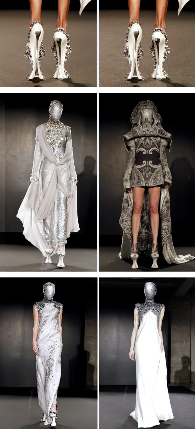 It would be unambiguous to say these are not your garden variety shoes, kudos to the models who manoeuvred these magnificent sculptures with there legs and feet. Dutch designer Jan Taminiau showed his "Tarnished Beauty" collection during Paris Haute Couture.